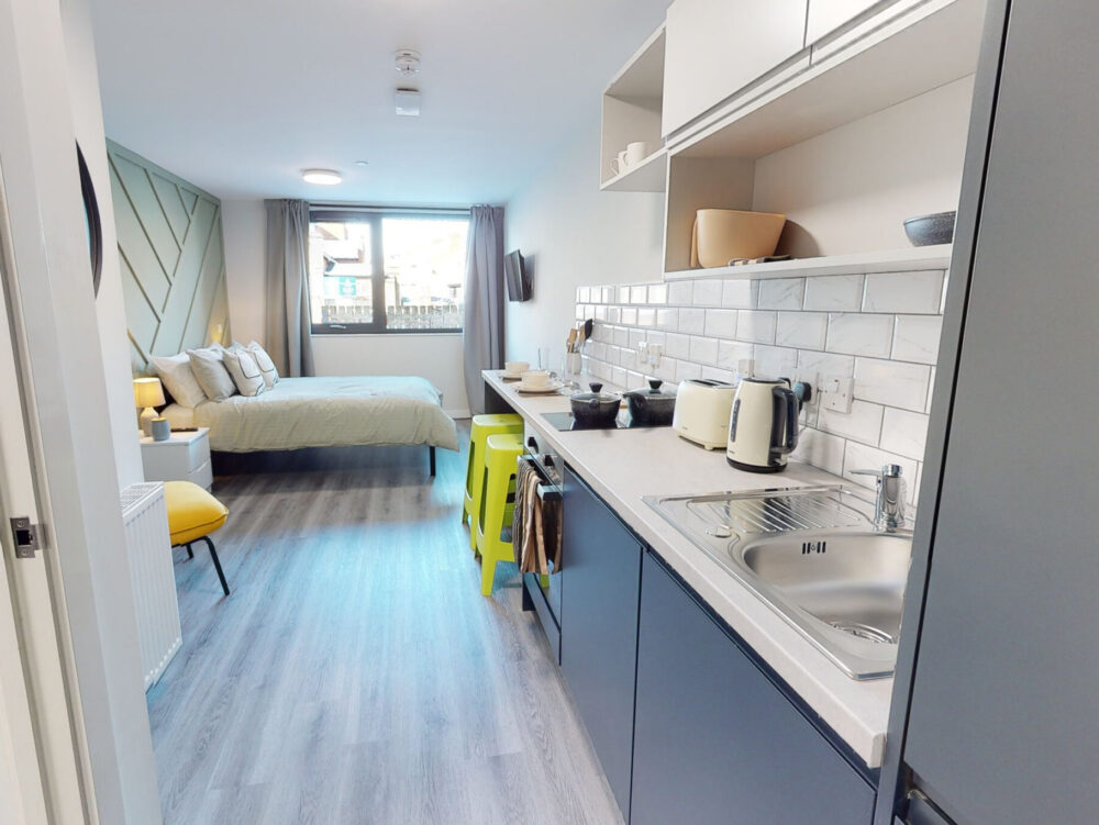 Our modern Studio Apartments are designed for comfort, convenience, and flexibility, making them the perfect choice for short-term stays. Each studio comes fully furnished with everything you need – a well-equipped kitchen, luxurious en-suite, comfortable double bed, fresh linens, towels, Smart TV, free WiFi, and more.